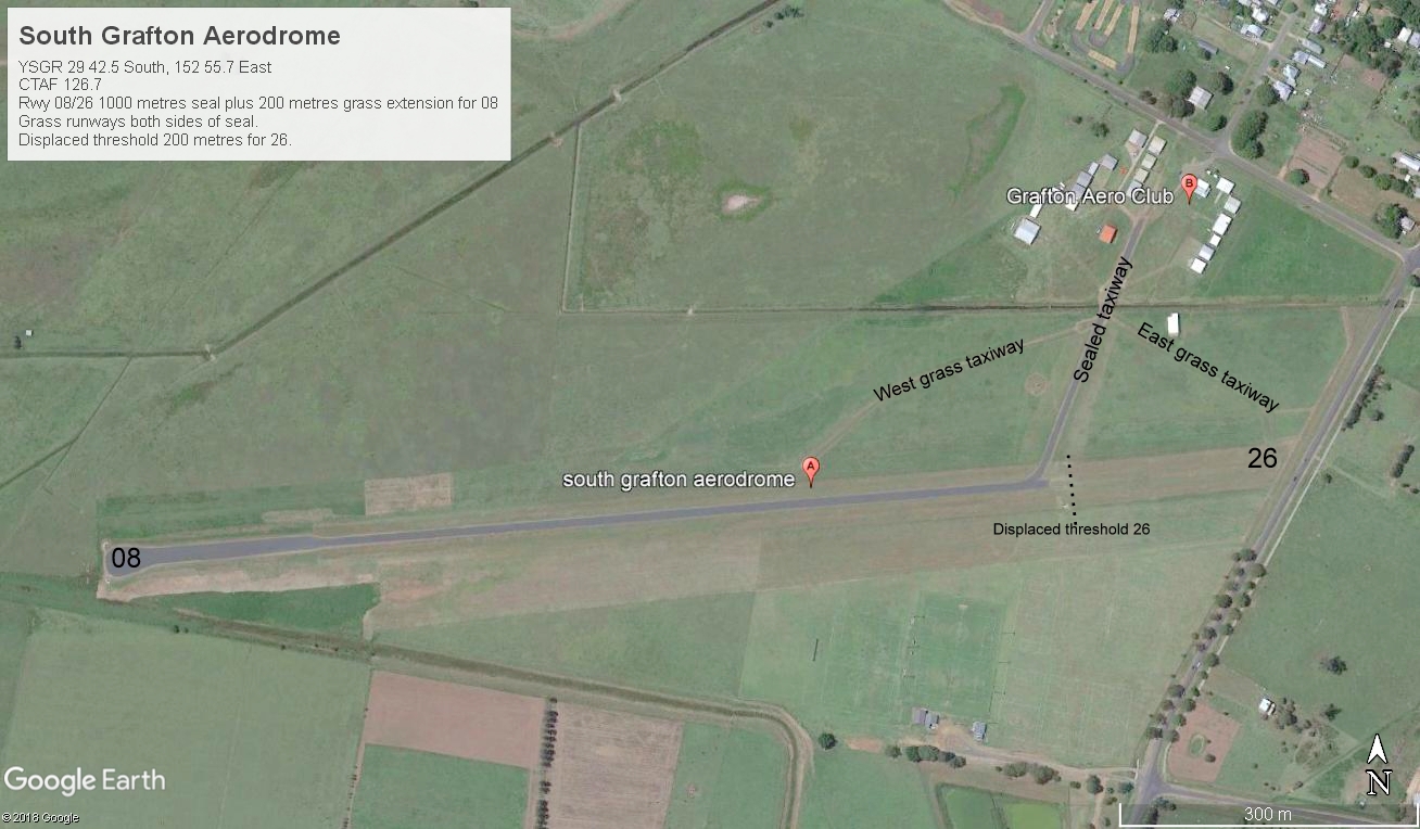 Runway…………………08/26 – 1000 metres seal, Grass runways either side, 200 metres grass extension for 08, total length 1200m. Left hand circuit.
